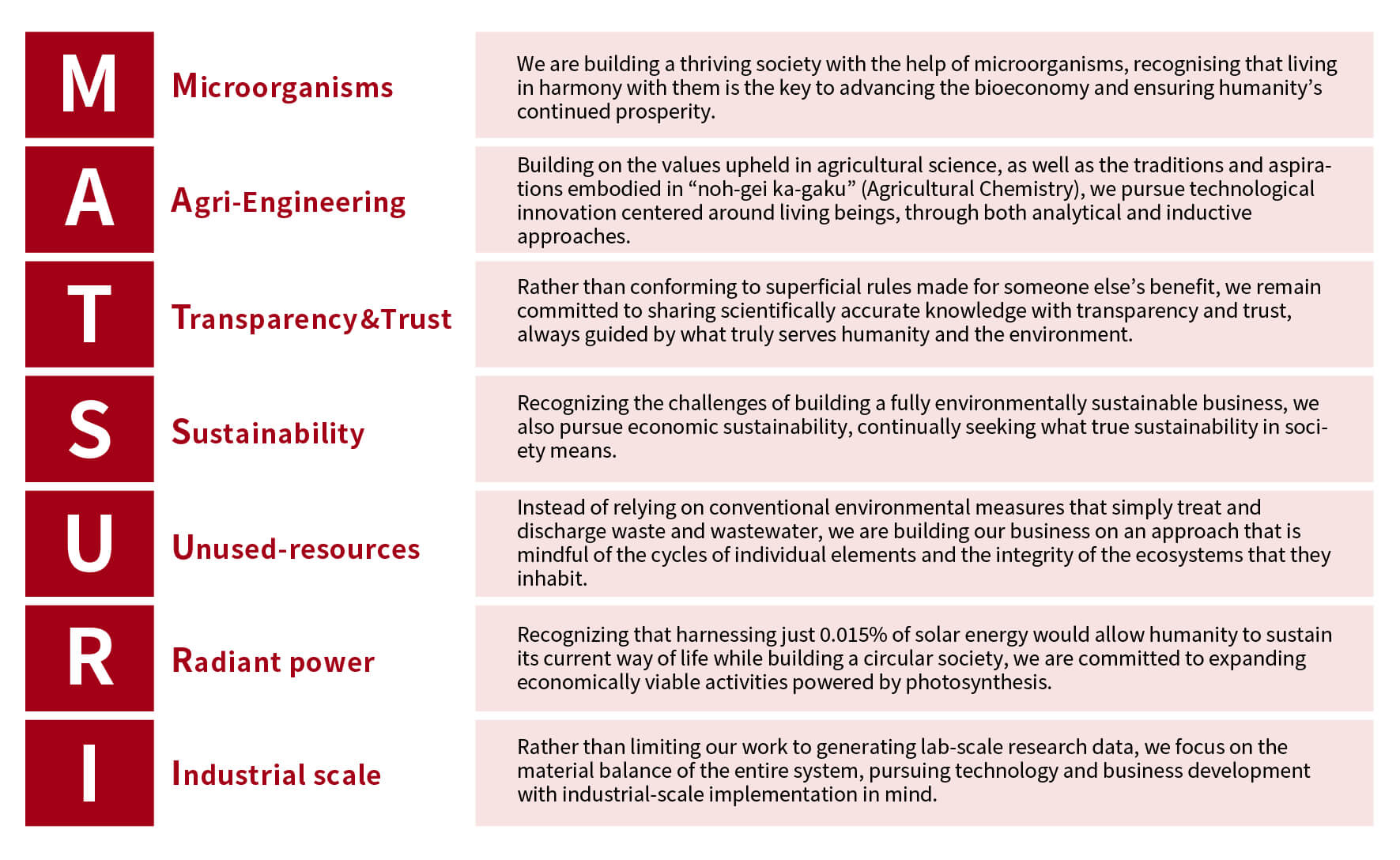 The name “MATSURI” reflects seven key values that are essential to making this vision a reality.