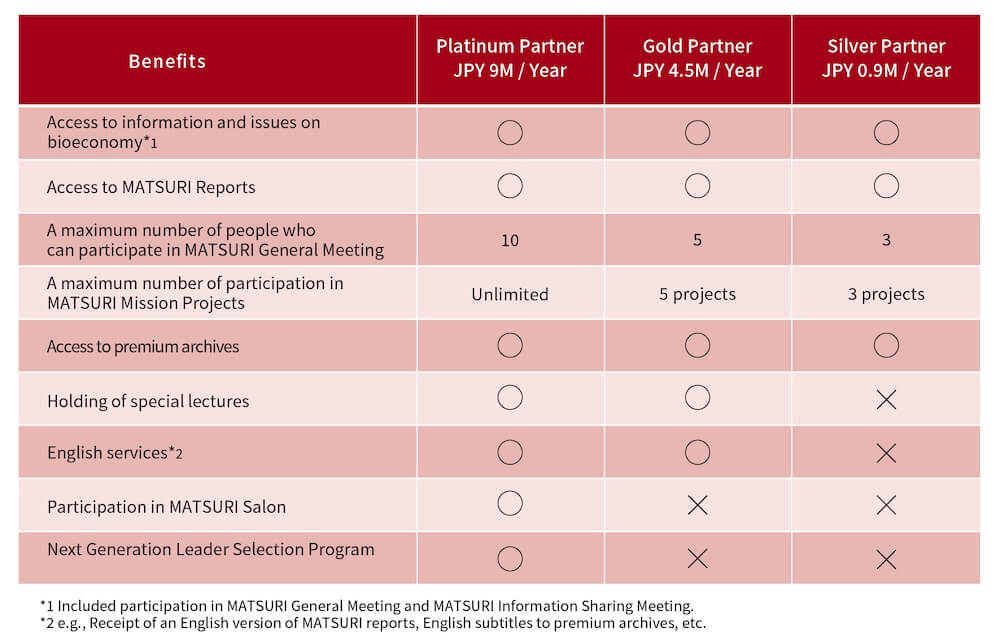 MATSURI offers several partnership tiers for corporations and public institutions. Each tier provides different levels of access to information, projects, and co-creation opportunities.
